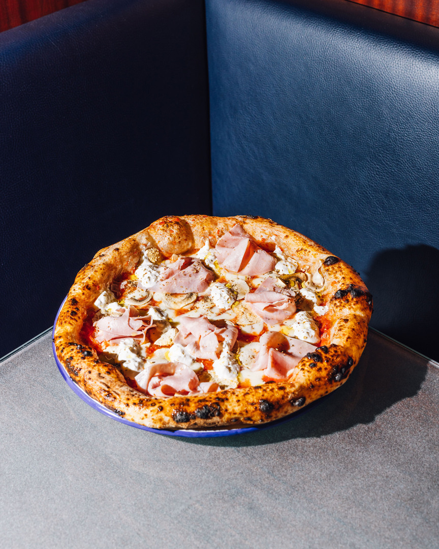 Tomates San Marzano DOP, mozzarella fior di latte, champignons de Paris, prosciutto cotto,