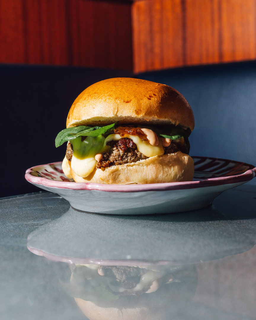 Bun artisanal, boeuf Gabin, tomme de Savoie au lait cru, oignons confits, pousses d’épinard,