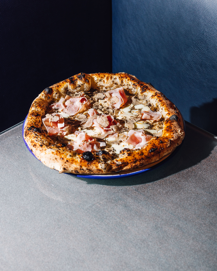 Crème de truffe, mozzarella fior di latte, champignons de Paris, proscuitto cotto, copeaux de truffe.